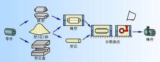 我们有色的小编特地在网上找了几幅有关砂型铸造的工艺示意图,让大家通过图表和模拟现场图片,对我们砂型铸造有更深刻的了解,具体图表如下: